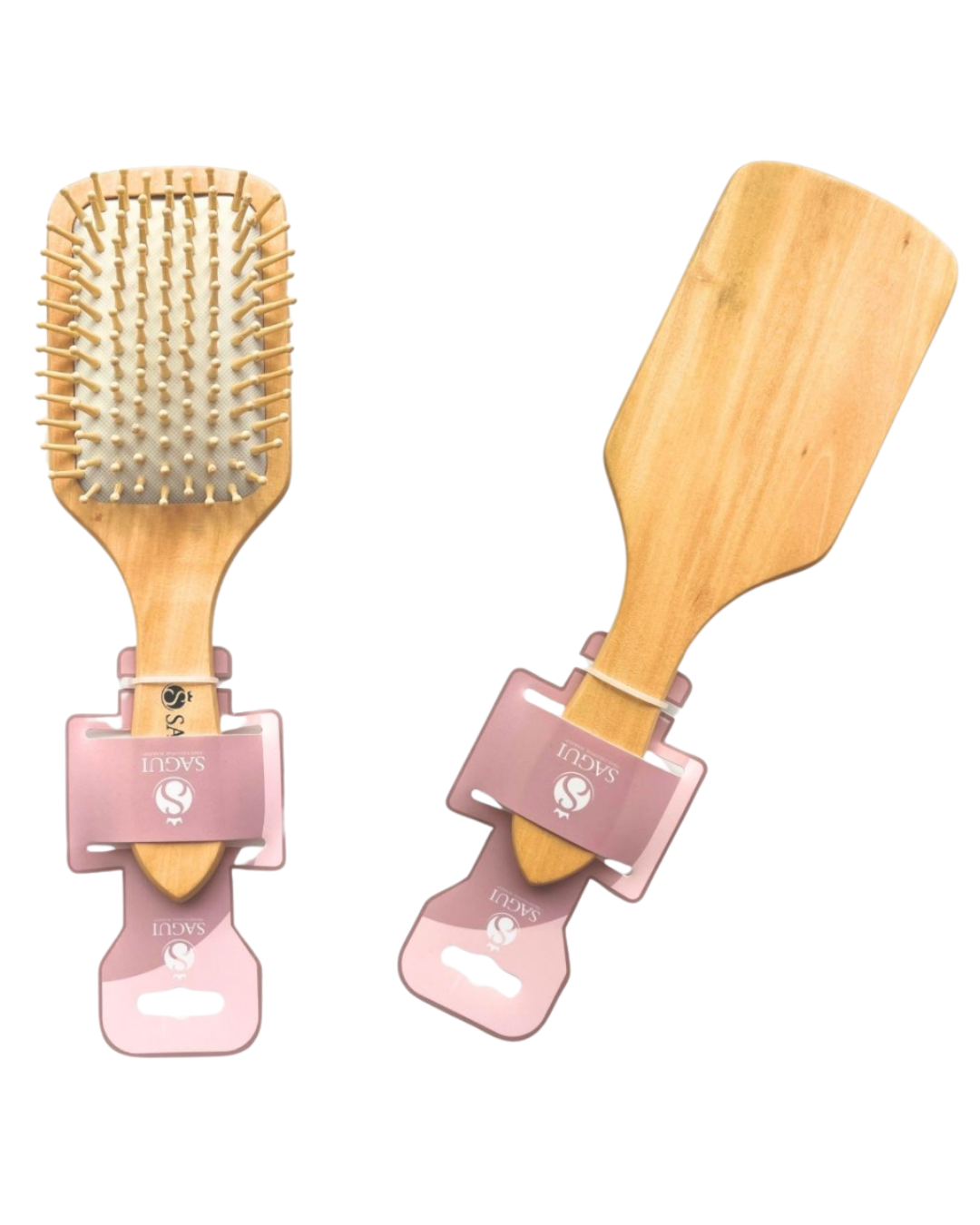 Cepillo ecológico en madera y cerdas de bambú, diseñado para cuidar tu cabello de forma natural.