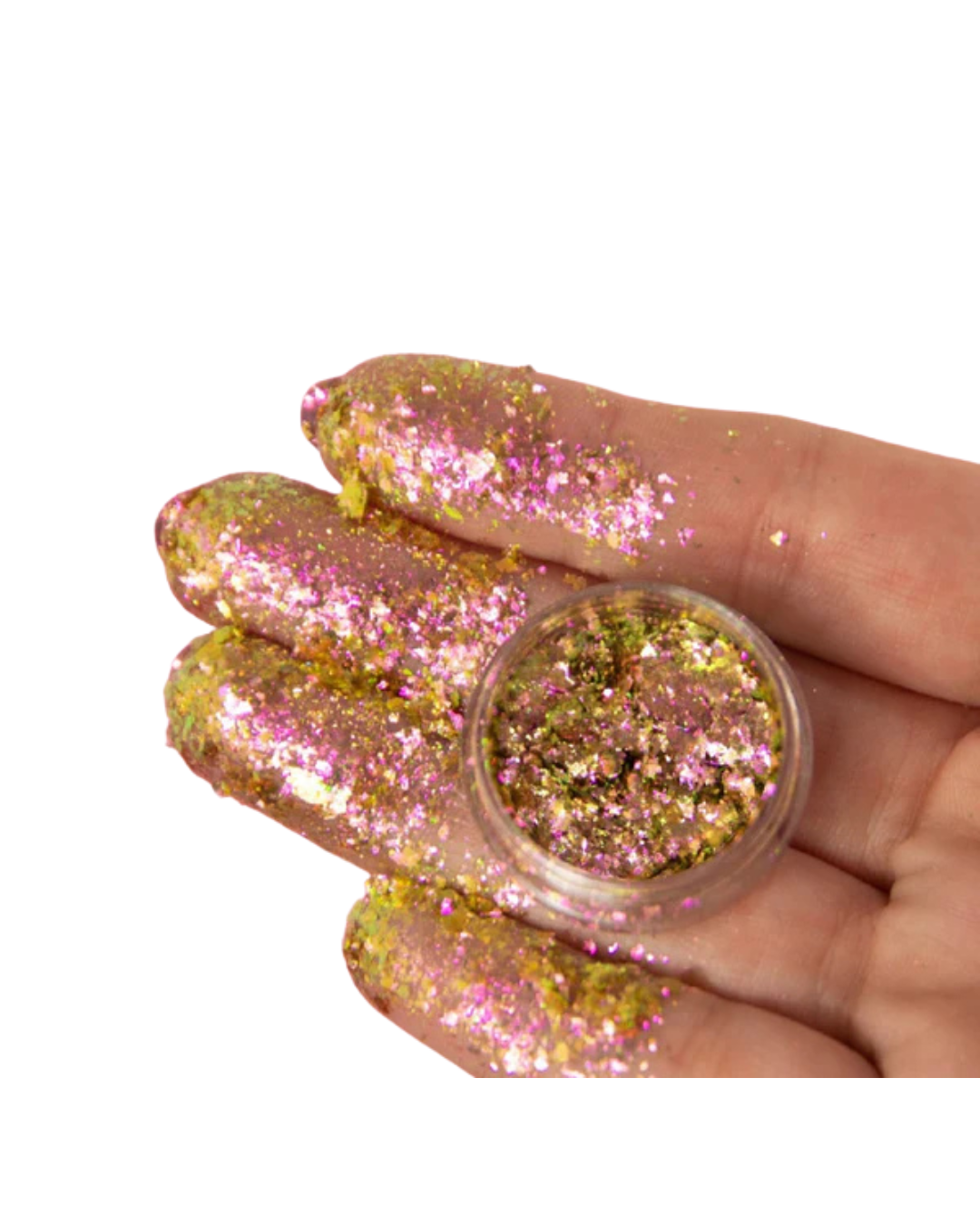 Partícula metálica multicromática que cambia de color según la luz. Tamaño entre 10 y 2000 micras. Se usa sobre base adhesiva, preferiblemente pegante de pigmentos Naba, para mejor fijación sin alterar el color.